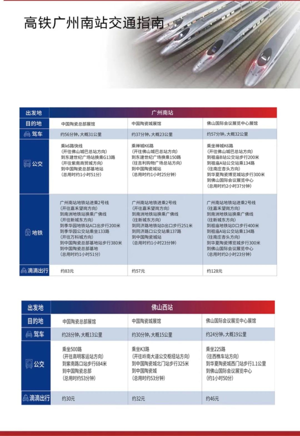 展期如何能夠快速抵達三展館,我們已經(jīng)安排好了佛山陶博會免費穿梭巴士,三展館之間自由免費穿梭。同時也整理好了交通攻略,記得下載保存哦!